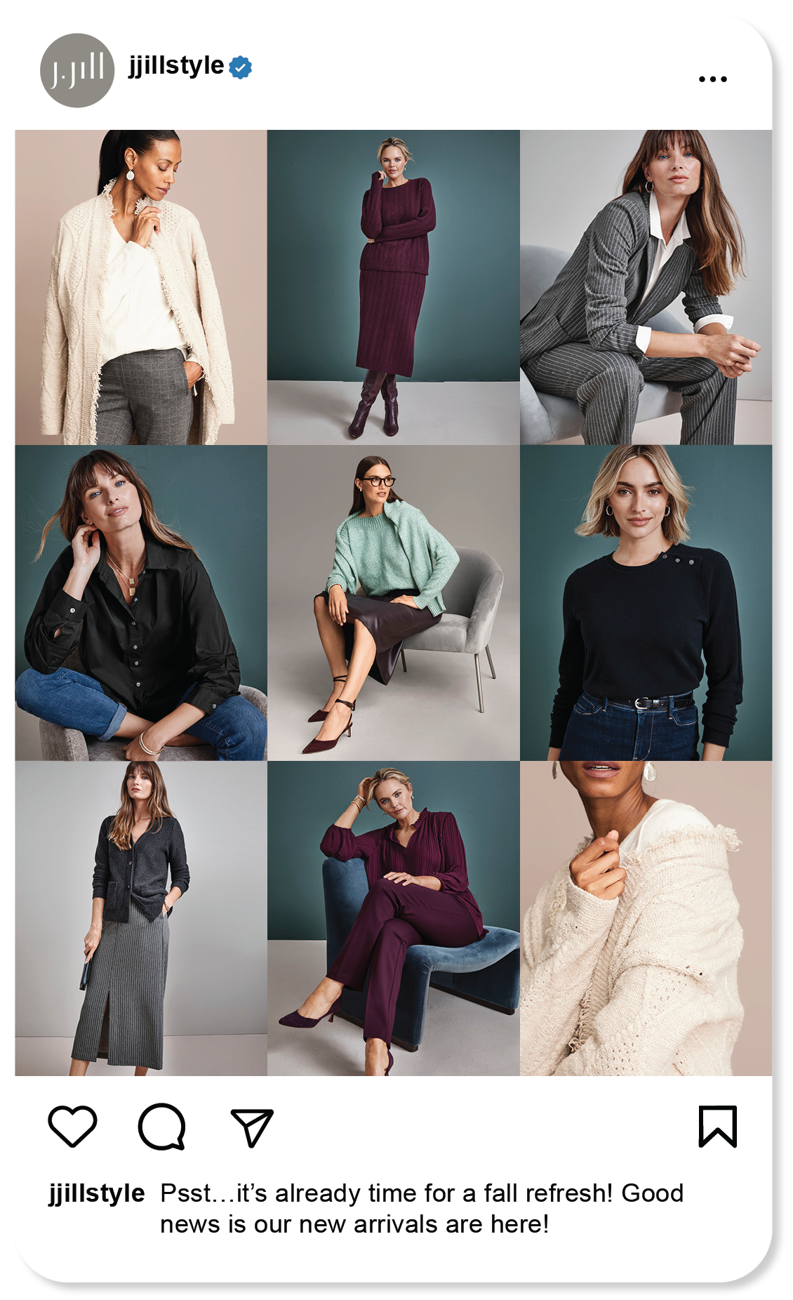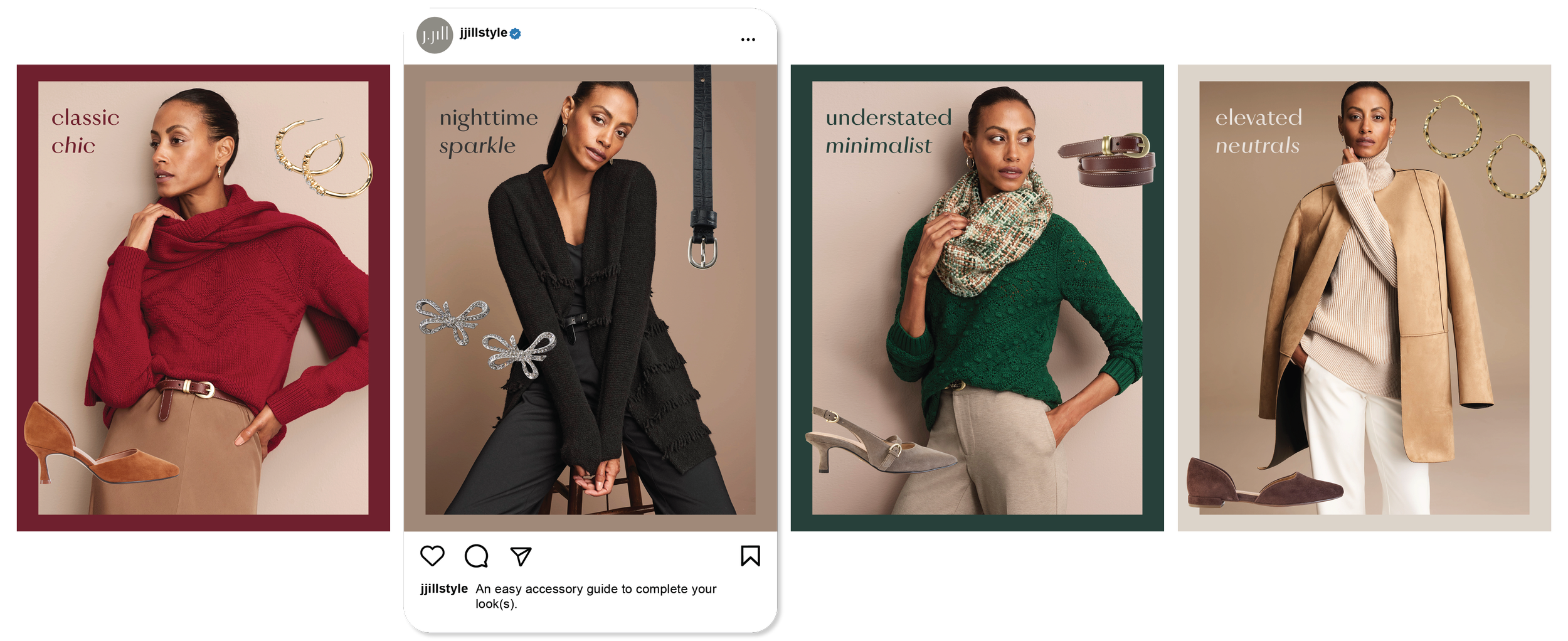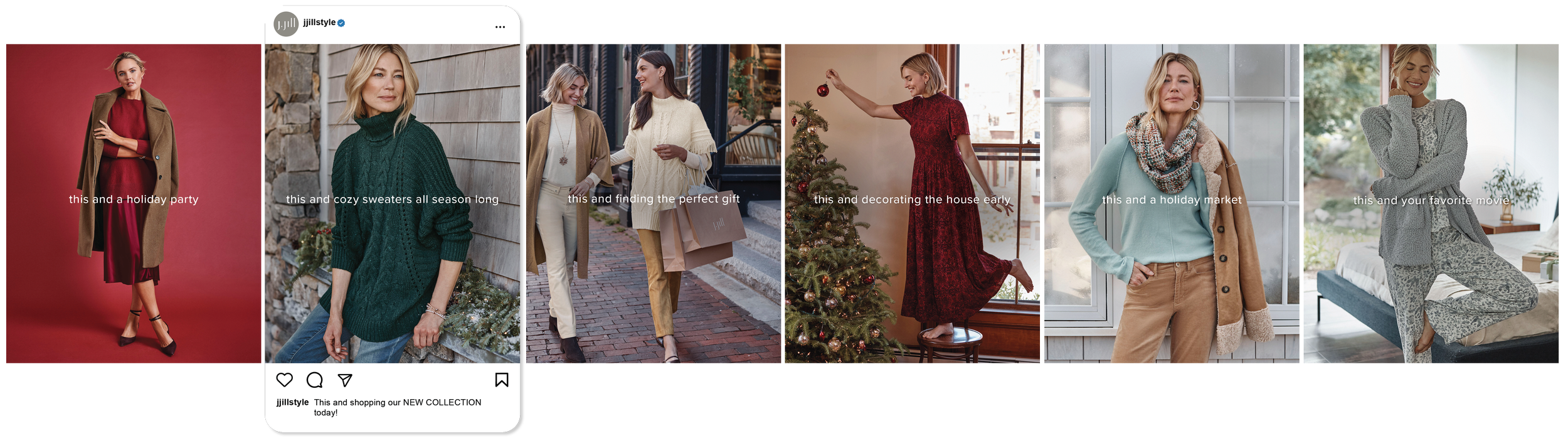 From concept through execution, I developed seasonal social content for J.Jill, including single-image posts and multi-slide carousels that are grounded in brand values and built with a social-first mindset. Each piece was crafted to drive meaningful engagement, elevate digital presence, and translate seasonal narratives into scroll-stopping visual moments.
